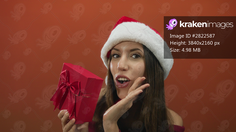 Young hispanic woman wearing a red santa hat holds red gift box in studio setting against an orange backdrop; holiday joy.