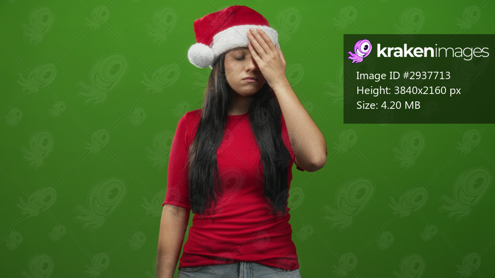 Young hispanic woman wearing a santa hat and red shirt covers one eye with her hand, long dark hair visible, standing in a green studio; holiday frustration. - Kraken Images