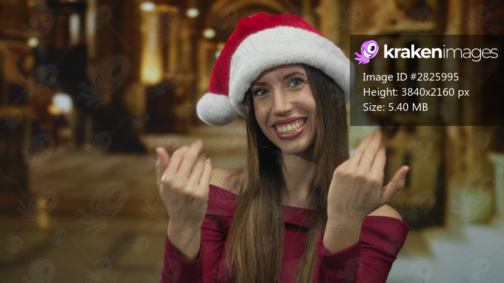 Young hispanic woman wearing a santa hat smiling shows open palms in building interior; holiday joy.