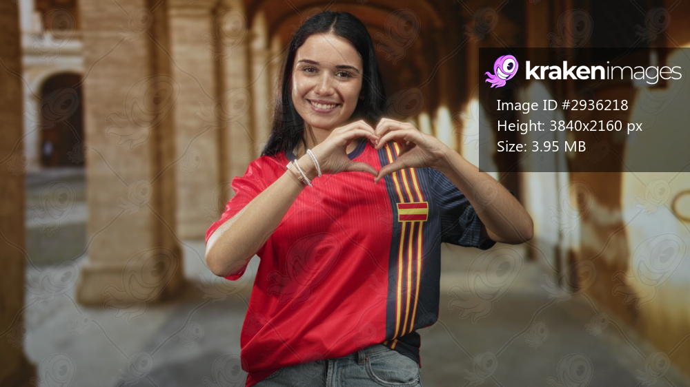 Young hispanic woman wearing a spanish soccer team jersey forms a heart with her hands while smiling in a sunlit arched building corridor; team pride.
