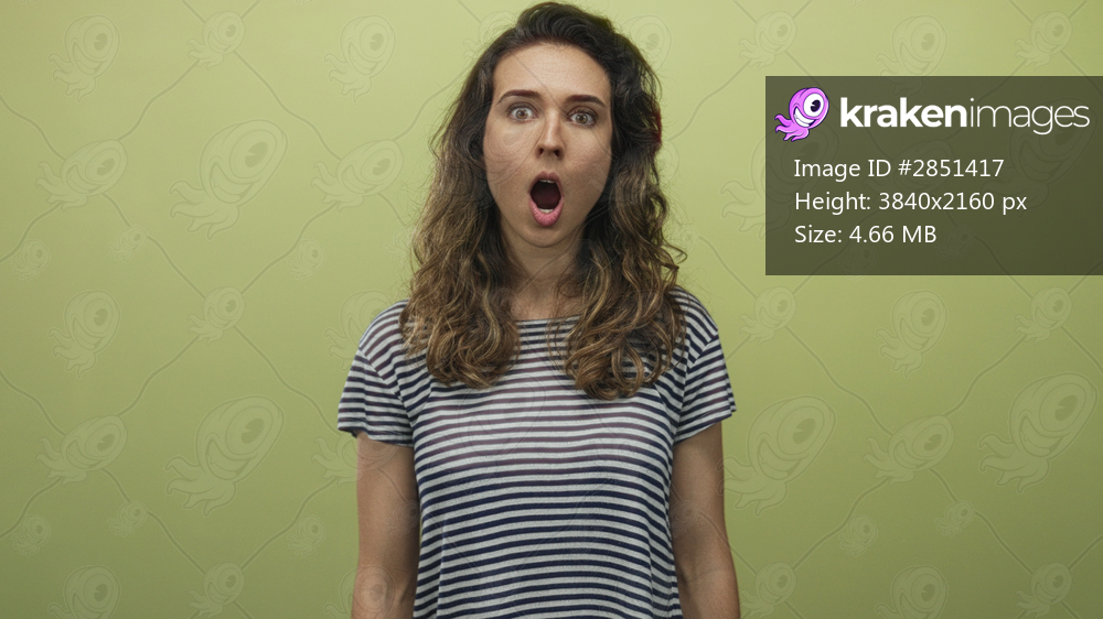 Young hispanic woman wearing a striped shirt with mouth open in surprise in a light green studio; astonishment.