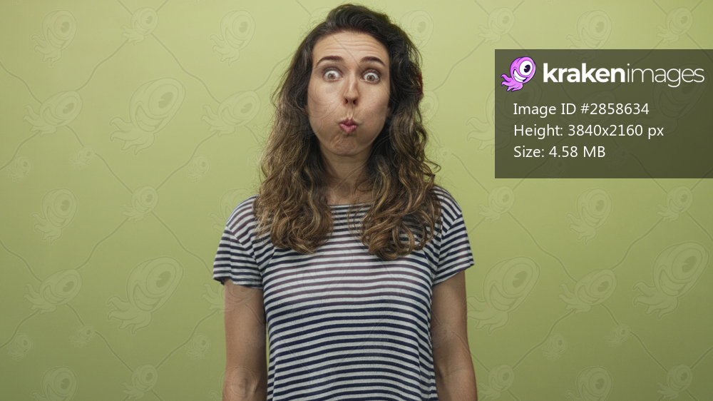 Young hispanic woman wearing a striped shirt with mouth open in surprise in a light green studio; astonishment.