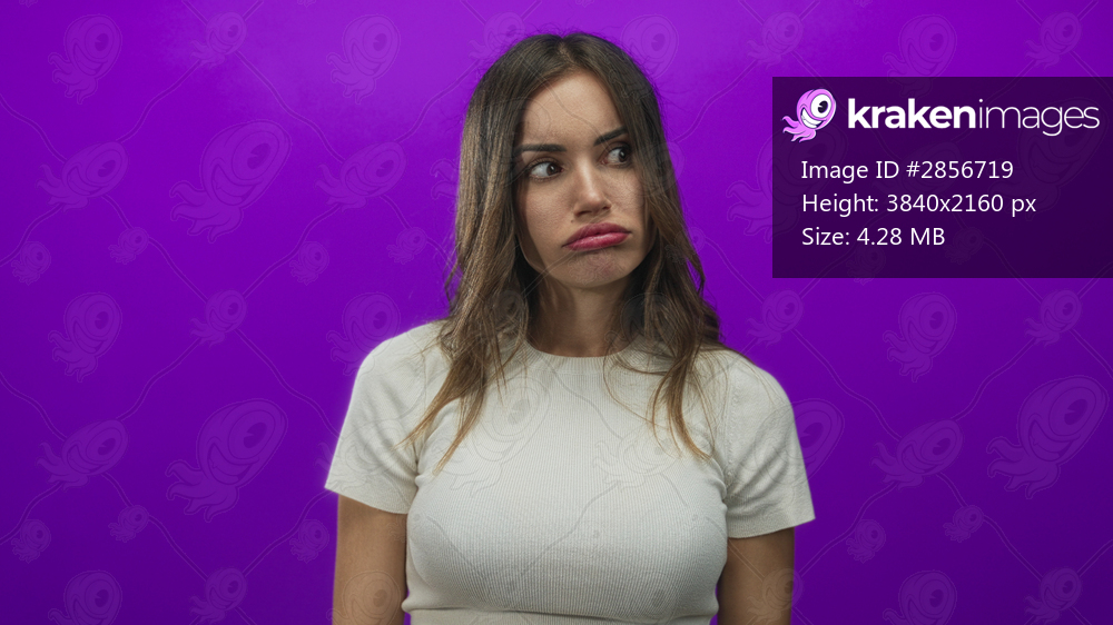 Young hispanic woman wearing a white shirt with mouth open and eyes wide in a bold purple studio; astonishment.