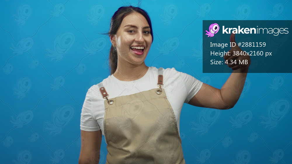 Young hispanic woman wearing beige apron and white shirt giving thumbs up in blue studio; cheerful approval.