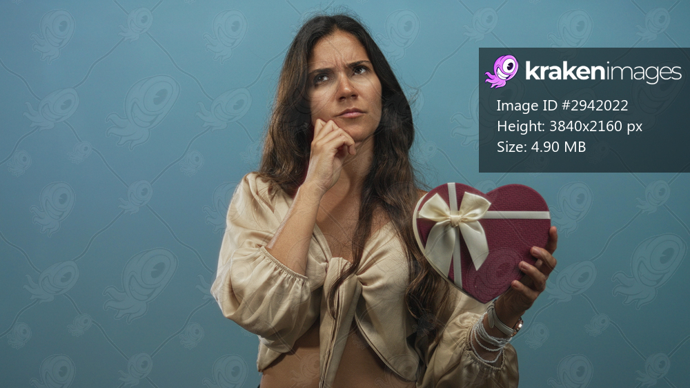 Young hispanic woman wearing beige blouse holding heart gift box with hand on chin in blue studio; doubt reflection.