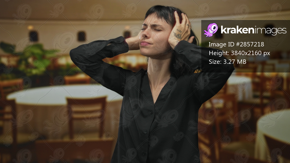 Young hispanic woman wearing black blouse covers ears with hands among tables in restaurant; frustration.