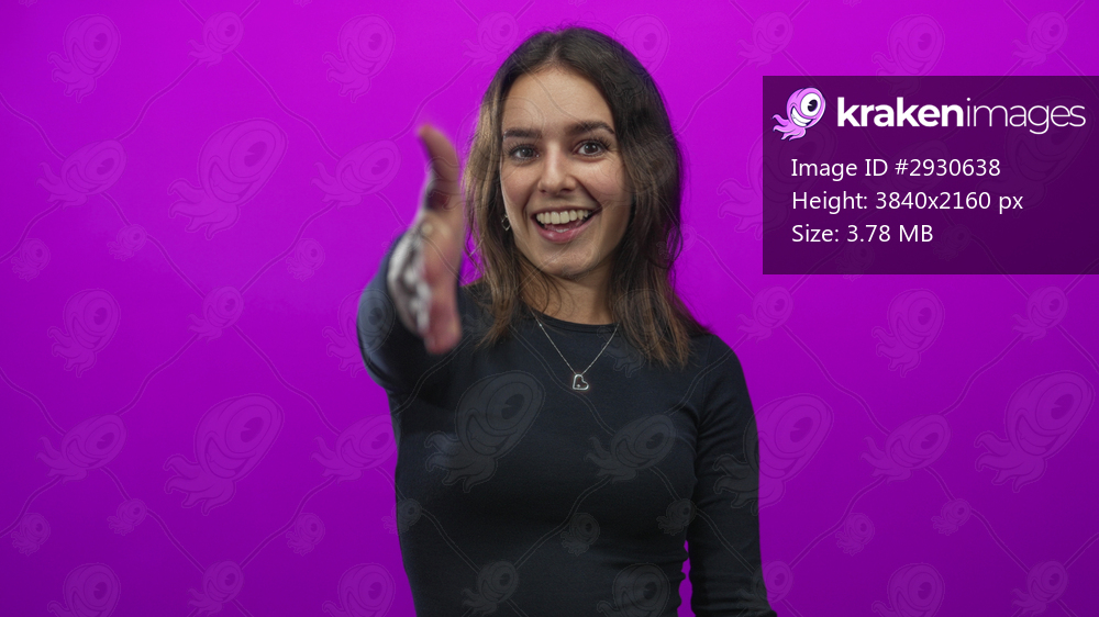 Young hispanic woman wearing black top and heart necklace extends hand for handshake in studio with magenta backdrop; friendly welcome.