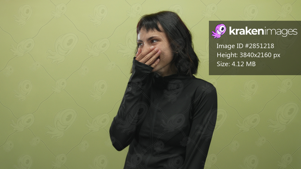 Young hispanic woman wearing black zip up jacket and active top with hand covering mouth laughing in studio; joy.