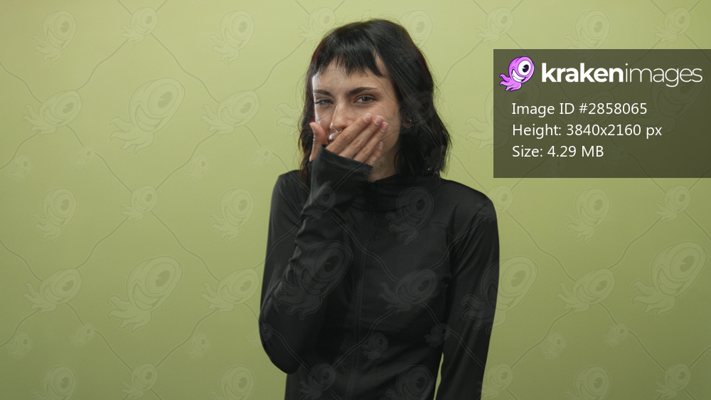 Young hispanic woman wearing black zip up jacket and active top with hand covering mouth laughing in studio; joy.