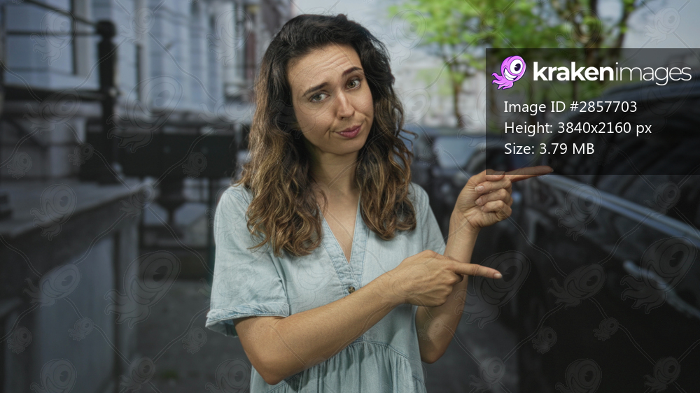 Young hispanic woman wearing blue dress pointing finger at car door on street; uncertainty seeking clarity.