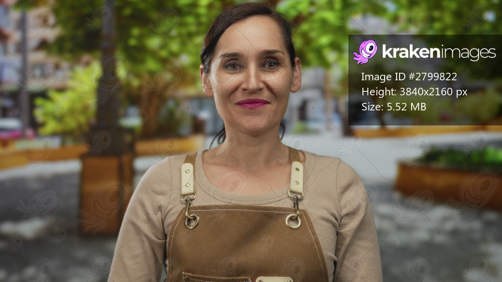 Young hispanic woman wearing brown apron with hair tied back in ponytail points with finger in park; surprise curiosity amazement wonder.