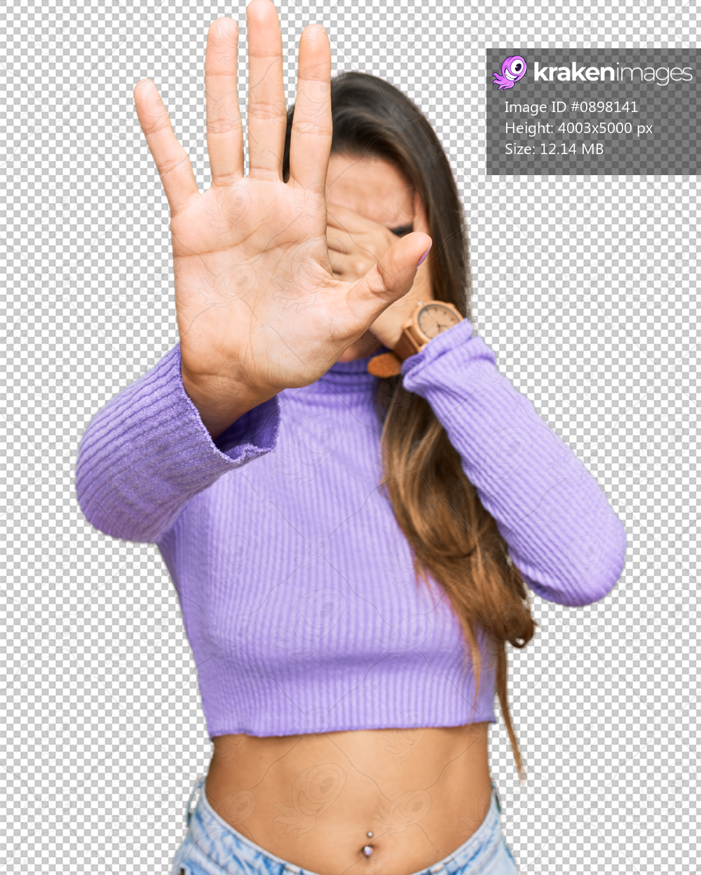 Young hispanic woman wearing casual clothes covering eyes with hands and doing stop gesture with sad and fear expression. embarrassed and negative concept. - Kraken Images