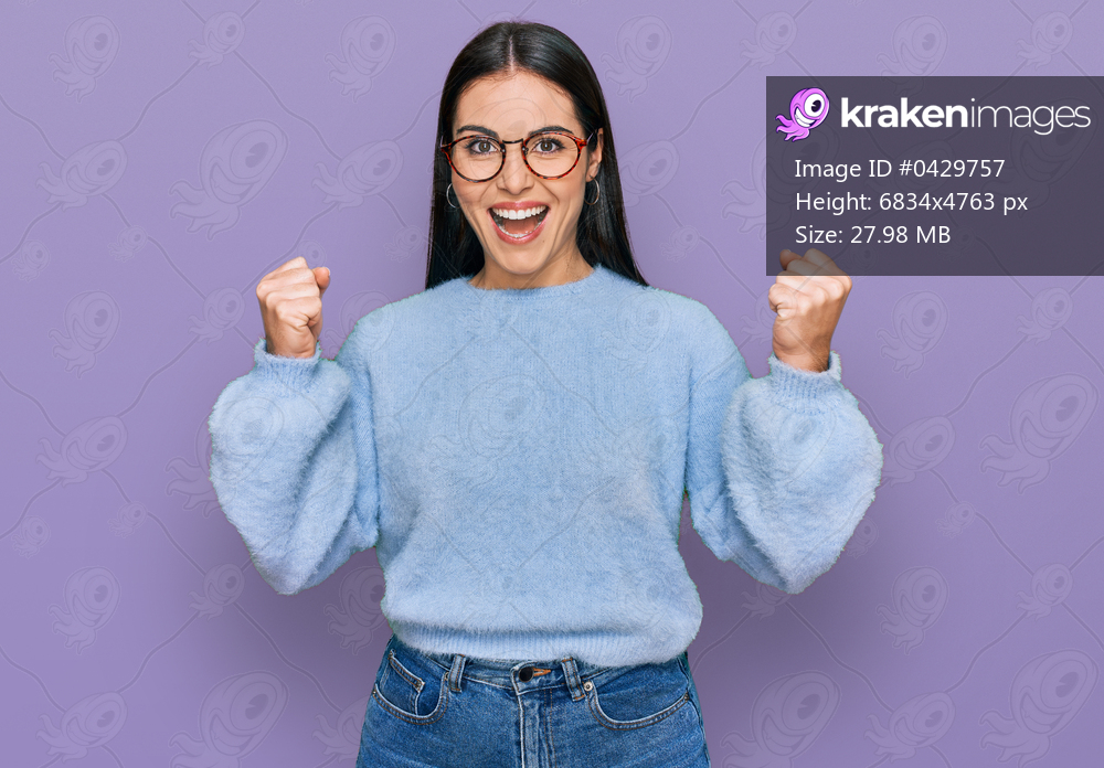 Young hispanic woman wearing casual clothes and glasses celebrating surprised and amazed for success with arms raised and open eyes. winner concept.
