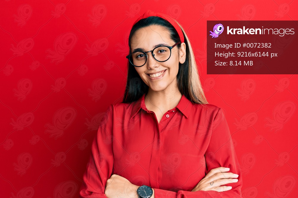 Young hispanic woman wearing casual clothes and glasses happy face smiling with crossed arms looking at the camera. positive person.