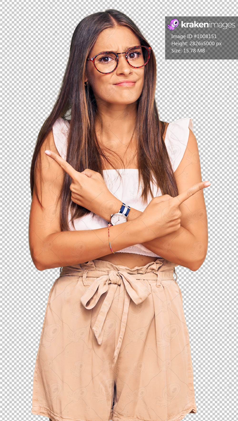 Young hispanic woman wearing casual clothes and glasses pointing to both sides with fingers, different direction disagree
