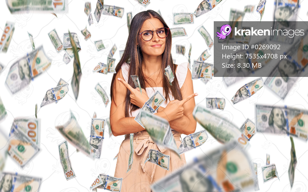 Young hispanic woman wearing casual clothes and glasses pointing to both sides with fingers, different direction disagree