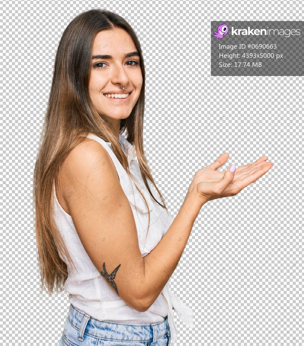 Young hispanic woman wearing casual clothes pointing aside with hands open palms showing copy space, presenting advertisement smiling excited happy