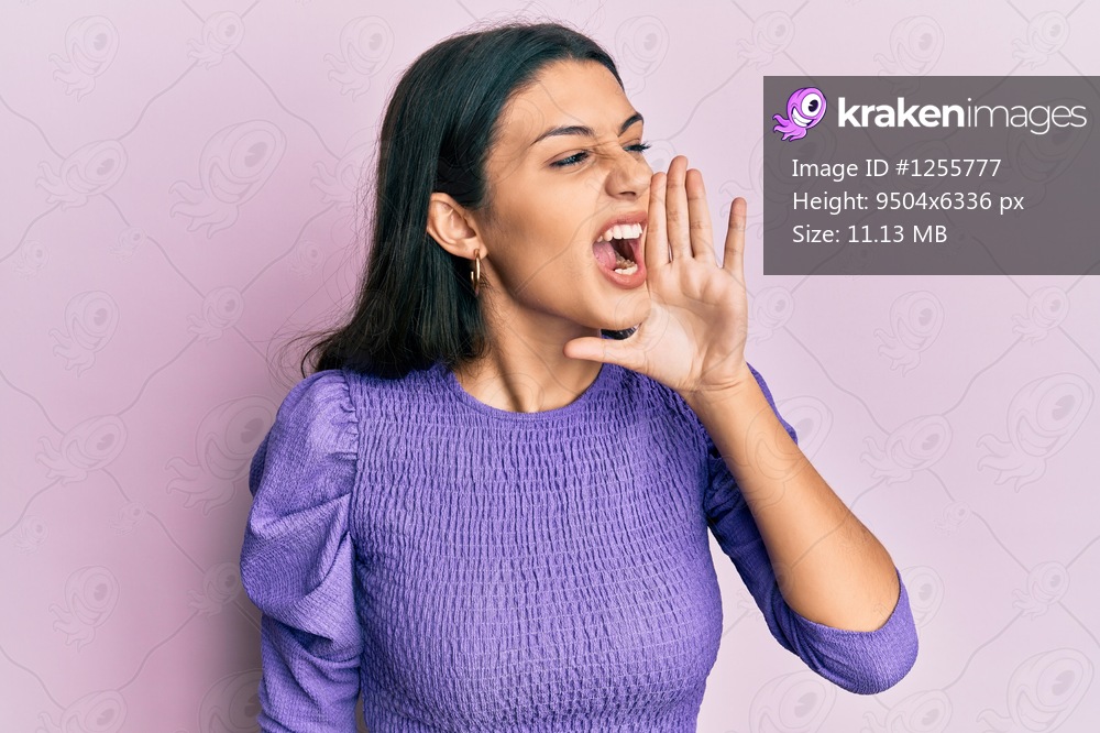 Young hispanic woman wearing casual clothes shouting and screaming loud to side with hand on mouth. communication concept.