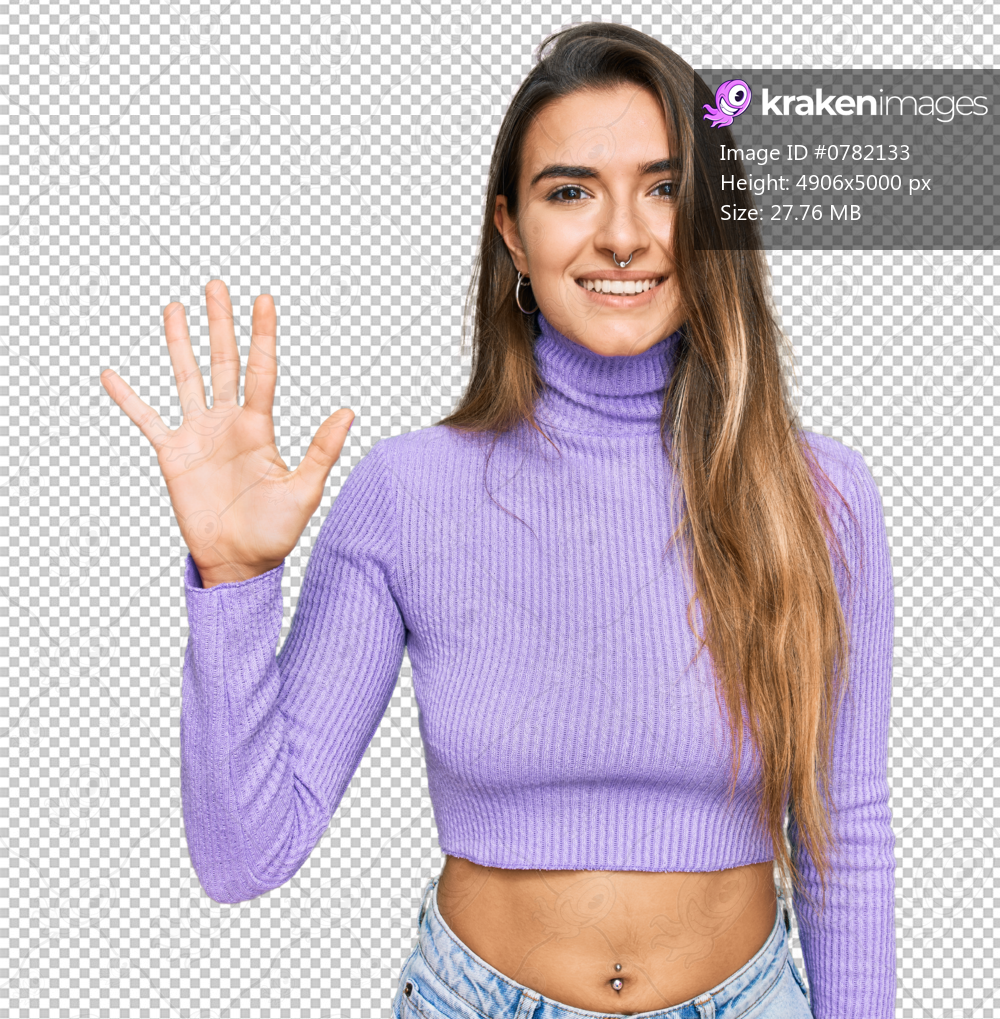 Young hispanic woman wearing casual clothes showing and pointing up with fingers number five while smiling confident and happy.