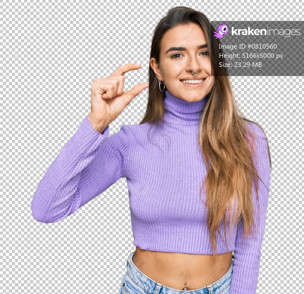 Young hispanic woman wearing casual clothes smiling and confident gesturing with hand doing small size sign with fingers looking and the camera. measure concept. - Kraken Images