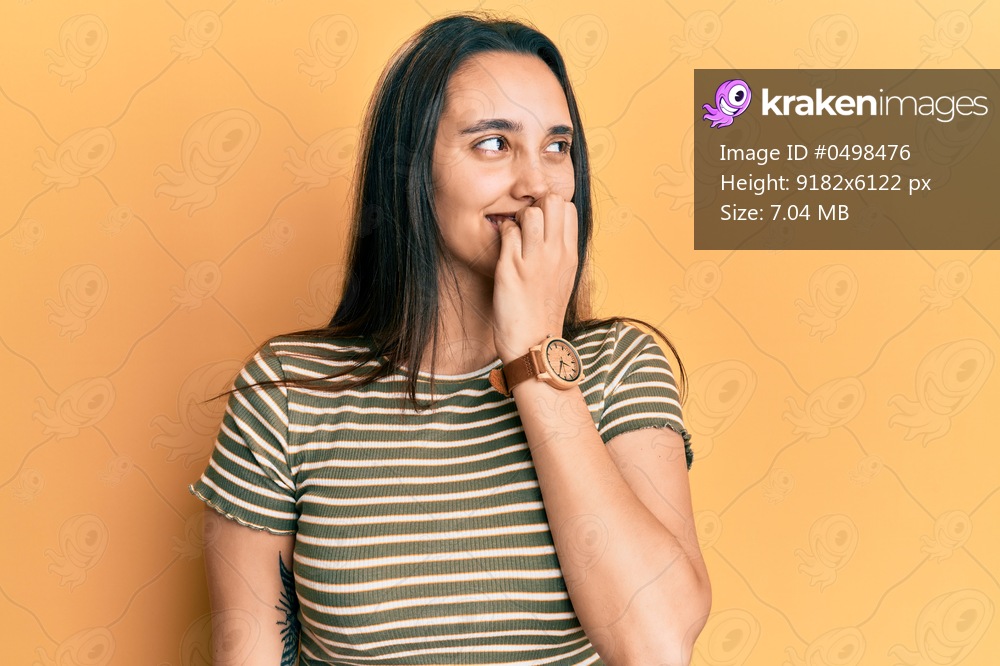 Young hispanic woman wearing casual striped t shirt looking stressed and nervous with hands on mouth biting nails. anxiety problem.
