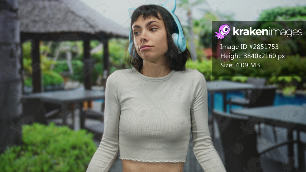 Young hispanic woman wearing cat ear headphones shrugs shoulders under bright sunlight in front of a building; uncertainty.