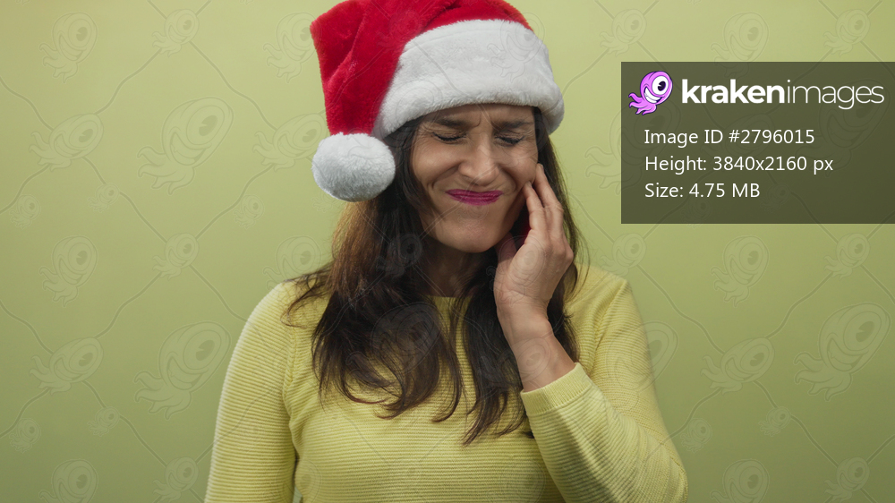 Young hispanic woman wearing christmas hat presses cheek with hand for toothache in a yellow studio; festive holiday discomfort pain.