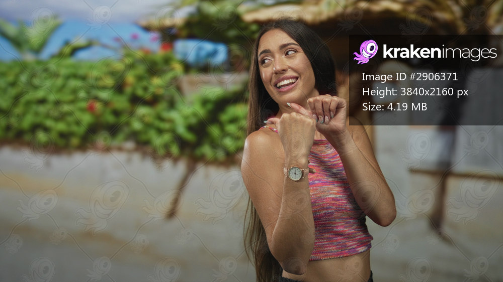 Young hispanic woman wearing colorful tanktop showing wristwatch and pointing thumbs to herself at building entrance outdoors near house wall; joyful confidence. - Kraken Images