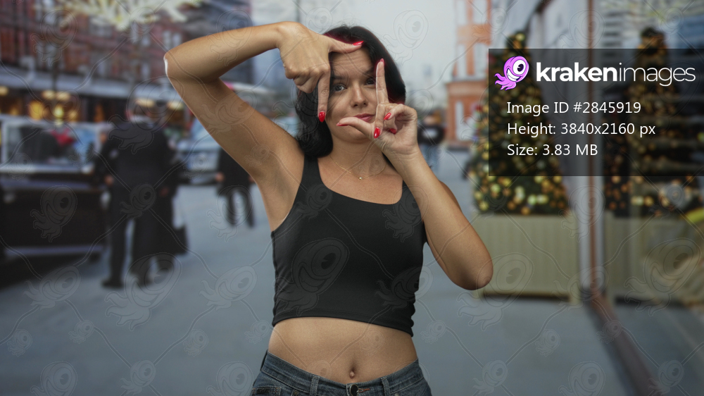 Young hispanic woman wearing cropped top and jeans forms frame with fingers on street by christmas tree display; playfulness.
