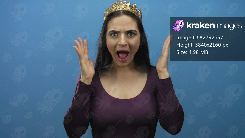 Young hispanic woman wearing crown against blue wall cheerfully expressing surprise and delight with open hands and wide eyes