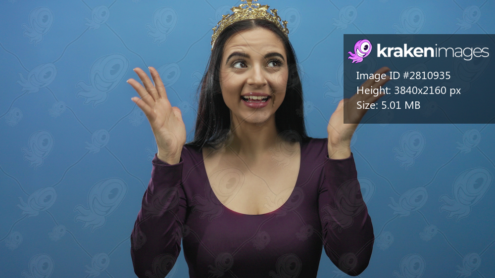 Young hispanic woman wearing crown against blue wall cheerfully expressing surprise and delight with open hands and wide eyes