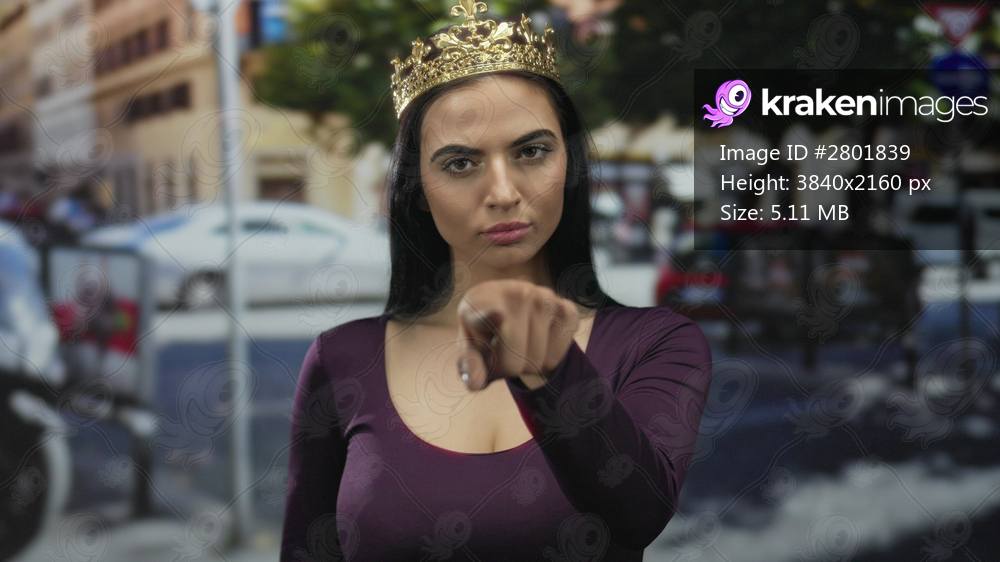 Young hispanic woman wearing crown outdoors on city street making vigilant gesture with determined expression on face.