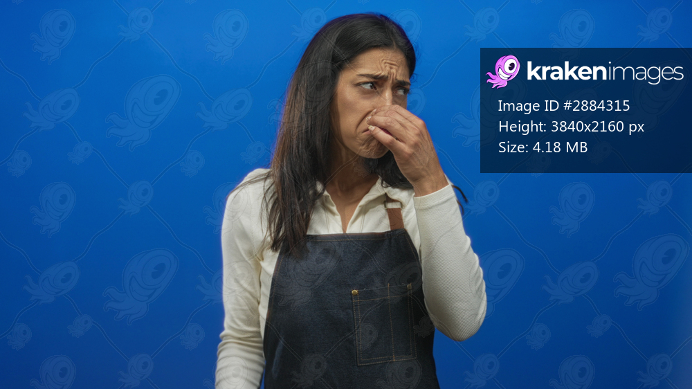 Young hispanic woman wearing denim apron and white shirt pinches nose in blue studio with displeased expression; disgust frustration fatigue.