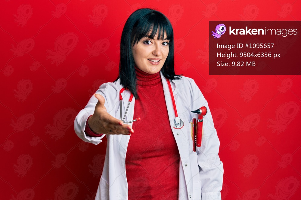 Young hispanic woman wearing doctor uniform and stethoscope smiling cheerful offering palm hand giving assistance and acceptance.