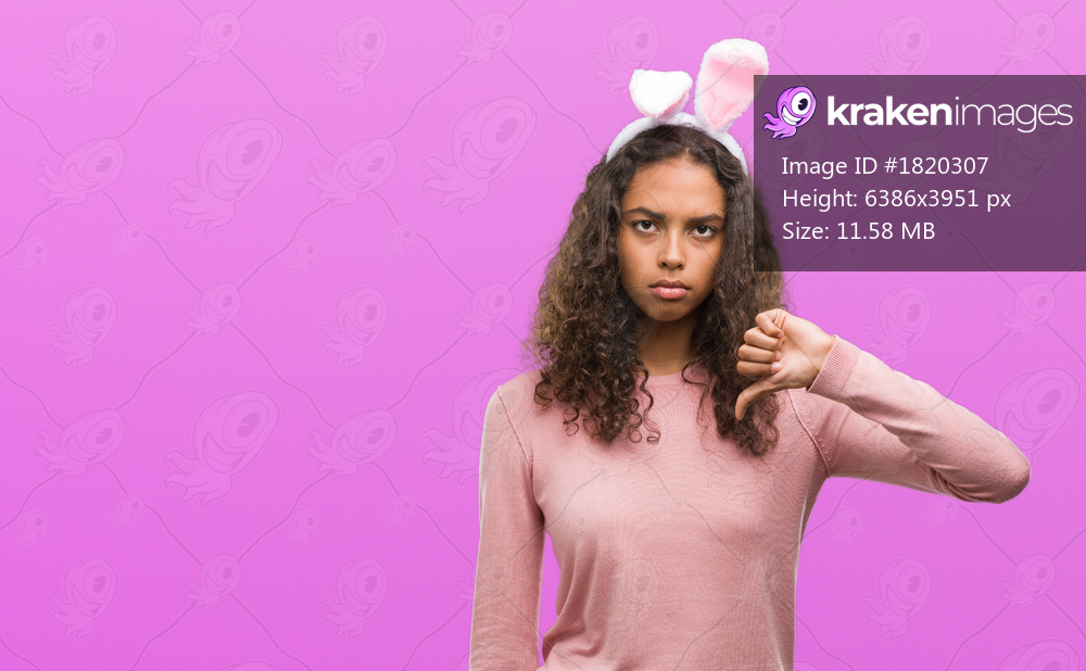 Young hispanic woman wearing easter bunny ears with angry face, negative sign showing dislike with thumbs down, rejection concept