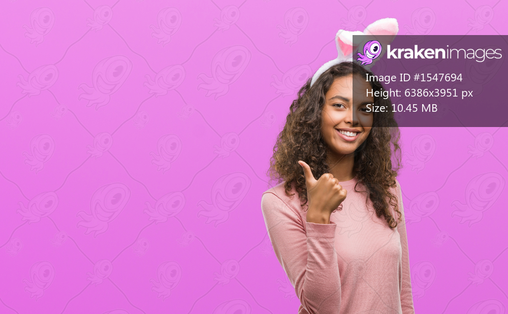 Young hispanic woman wearing easter bunny ears happy with big smile doing ok sign, thumb up with fingers, excellent sign