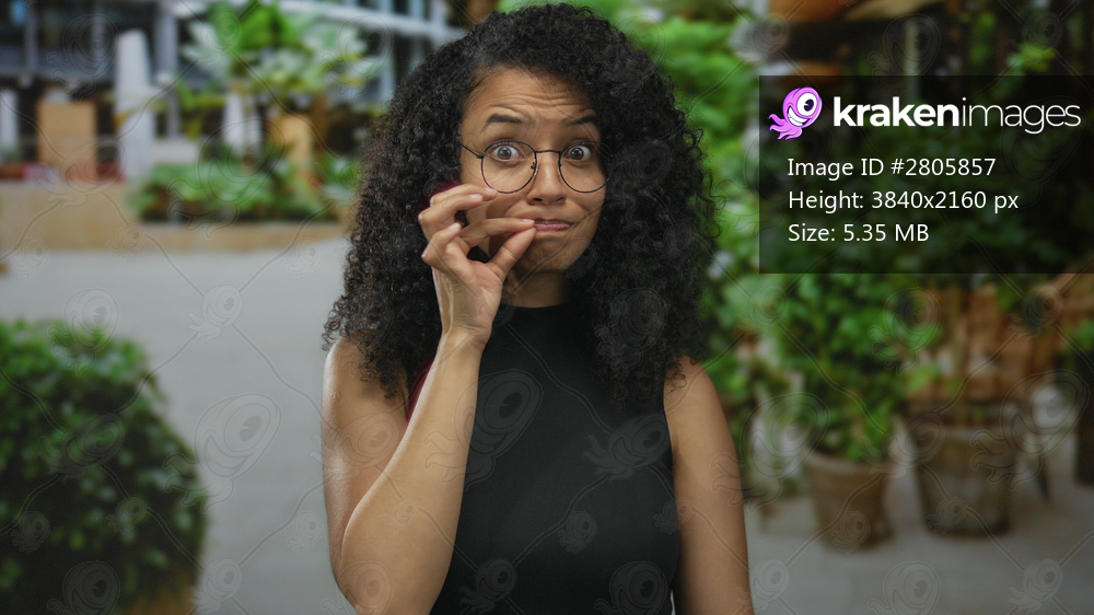 Young hispanic woman wearing eyeglasses holds finger to lips for silence on a street; secret calm introspection.