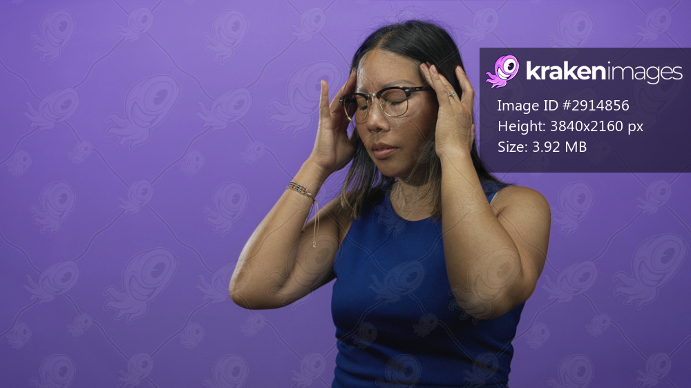 Young hispanic woman wearing glasses and a blue sleeveless top, with ring and bracelet, holding her temples and pressing her forehead in a purple studio; stress awareness. - Kraken Images