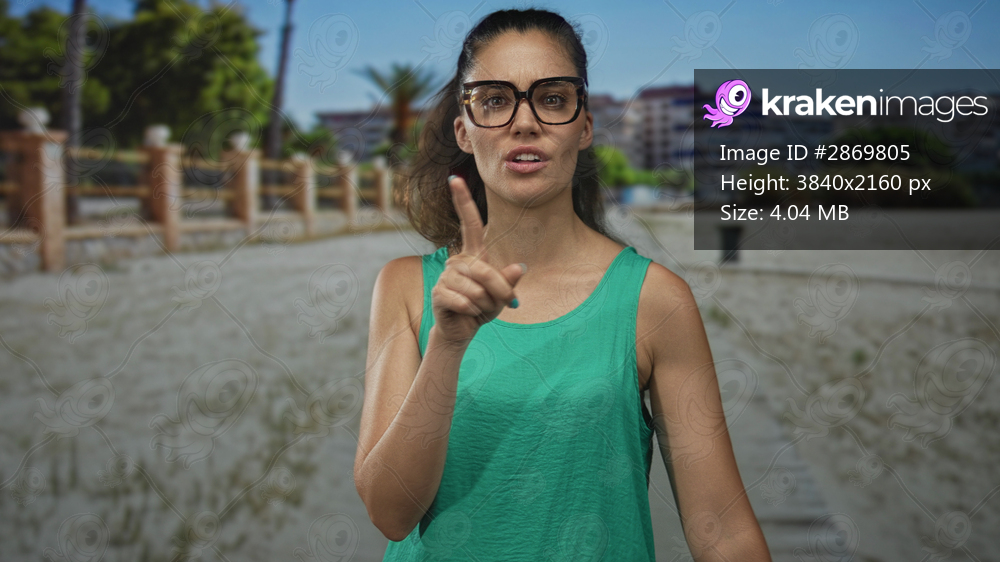 Young hispanic woman wearing glasses and a green tank top pointing finger and sticking out tongue on street promenade by buildings and trees under blue sky; anger. - Kraken Images