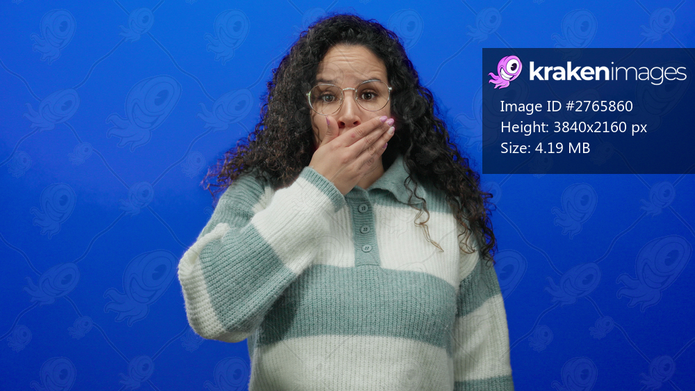 Young hispanic woman wearing glasses and a striped sweater covers her mouth in concern against an isolated blue background wall.