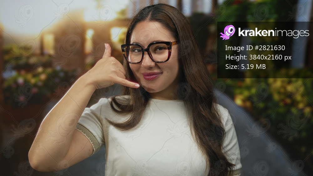 Young hispanic woman wearing glasses and a white shirt makes phone gesture with hand to ear in a street scene with green plants and evening sunlight; friendliness. - Kraken Images