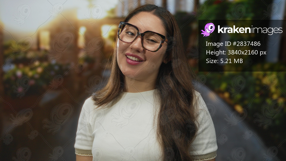 Young hispanic woman wearing glasses and a white shirt makes phone gesture with hand to ear in a street scene with green plants and evening sunlight; friendliness. - Kraken Images