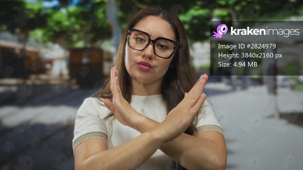 Young hispanic woman wearing glasses crosses slender arms with firm expression in sunlit city street scene; rejection.