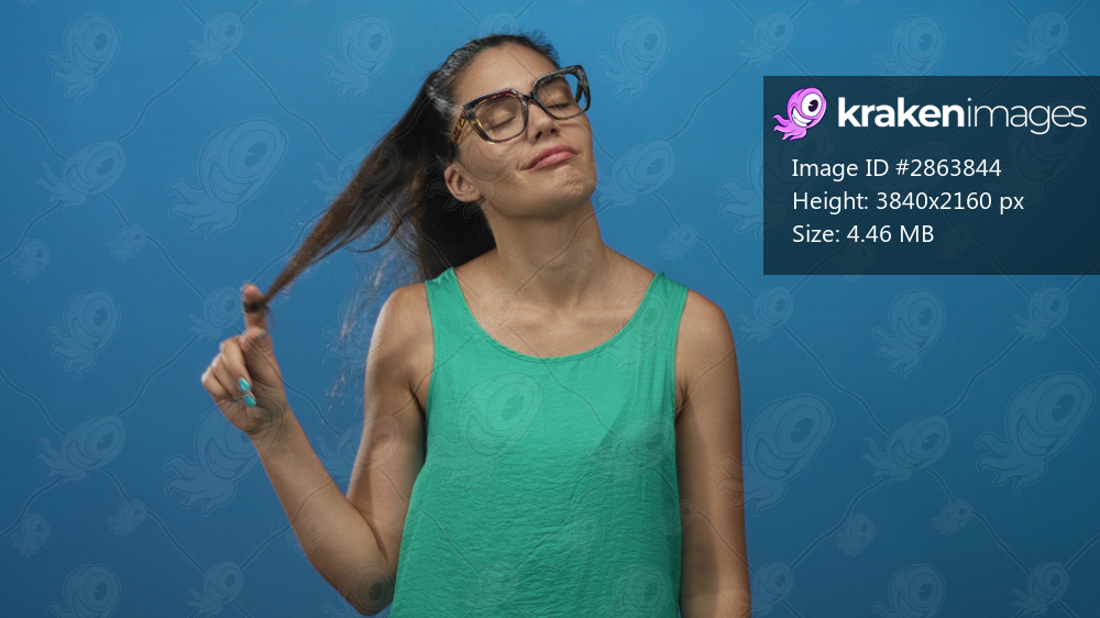 Young hispanic woman wearing glasses flips hair with closed eyes in vibrant blue studio under studio lighting; serenity.