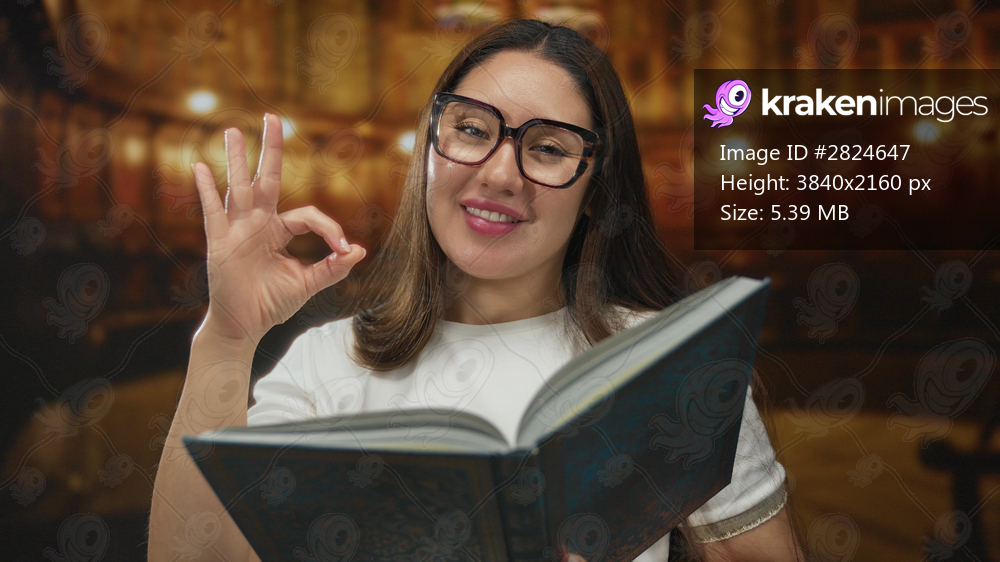 Young hispanic woman wearing glasses holding an open book and making ok sign in a church building; approval.