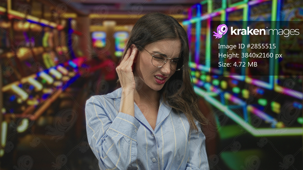 Young hispanic woman wearing glasses holds ear in front of slot machine inside casino building; discomfort.