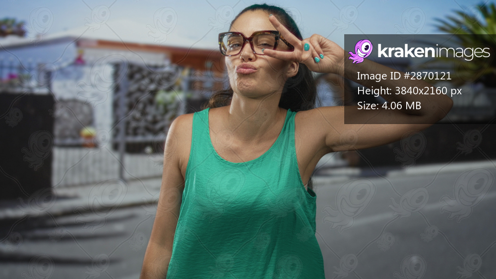 Young hispanic woman wearing glasses holds up hand in peace sign at street entrance; playful spirit.