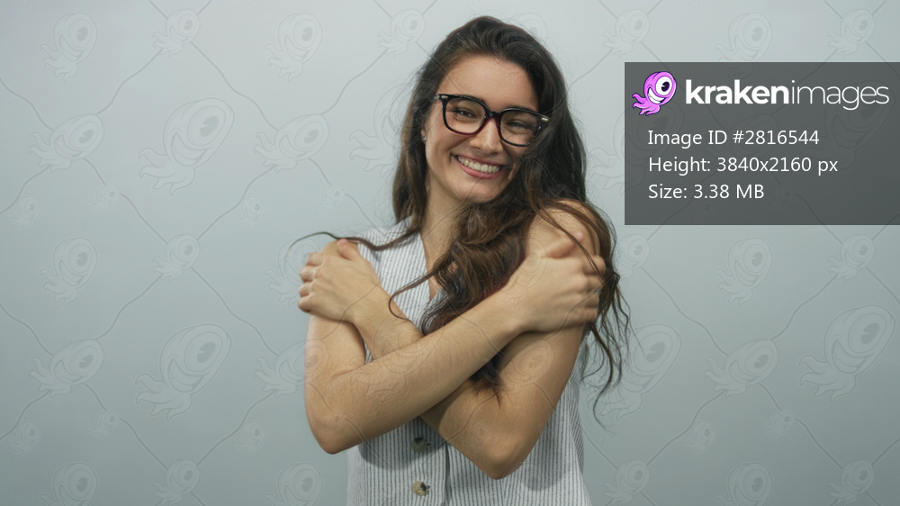 Young hispanic woman wearing glasses hugging arms across chest against light gray studio wall with long brown hair; selflove.