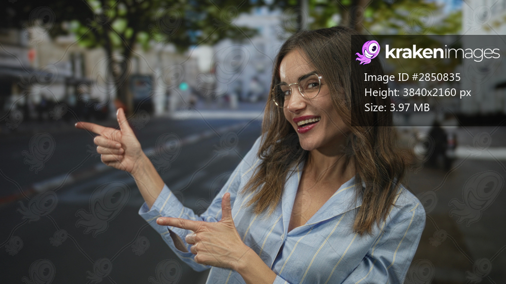 Young hispanic woman wearing glasses and light blue shirt smiles and points finger on a sunlit street; enthusiasm.