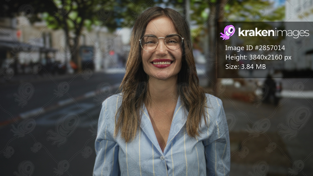 Young hispanic woman wearing glasses and light blue shirt smiles and points finger on a sunlit street; enthusiasm.